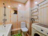 Санузел совмещенного типа выполнен с использованием качественного кафеля светлых оттенков, создающего атмосферу свежести и чистоты. Установлена металлическая ванна в хорошем состоянии.